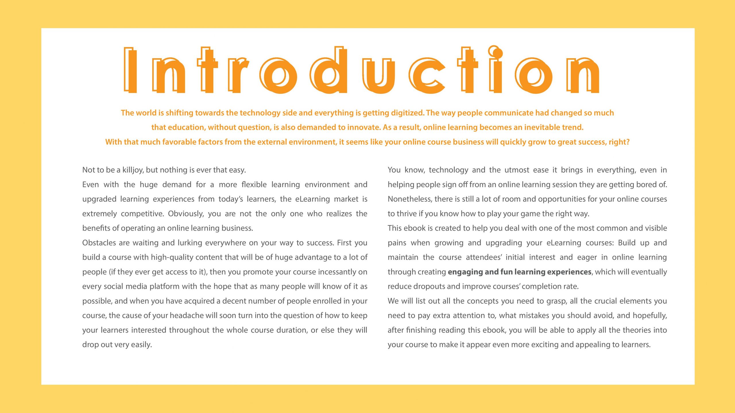 need to pay extra attention to, what mistakes you should avoid, and hopefully, after finishing reading this ebook, you will be able to apply all the theories into your course to make it appear even more exciting and appealing to learners.