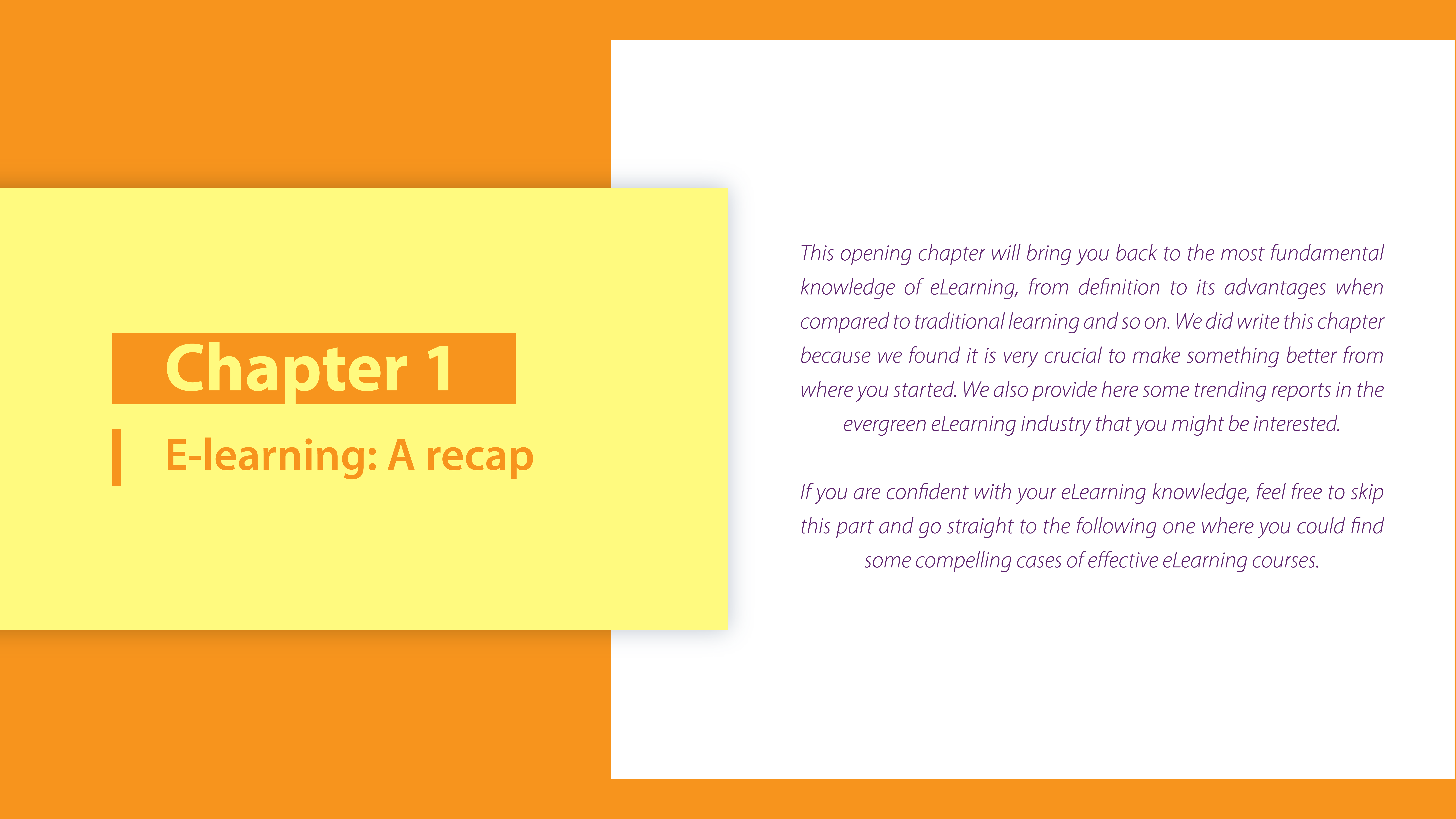 This ebook is for anyone who needs to improve the eLearning course effectively. To be more specific, you will go through 3 main sessions: